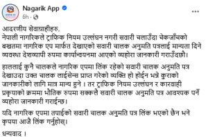 नागरिय एपको आधिकारीक फेसबुक पेजले पनि यसबारे जानकारी दिएको छ । नागरिक एपको फेसबुक पेजमा केहीबेर अघि लेखिएको छ–‘आदरणीय सेवाग्राहीहरु, नेपाली नागरिकले ट्राफिक नियम उल्लंघन नगरी सवारी चलाउँदा चेकजाँचको बखतमा नागरिक एप मार्फत देखाएको सवारी चालक अनुमति पत्रलाई मान्यता दिने व्यवस्था देशव्यापी रुपमा कार्यान्वयनमा आएको व्यहोरा जानकारी गराउँदछौ । यदि नागरिक एपमा तपाईको सवारी चालक अनुमति पत्र लिंक भएको छैन भने कृपया आजै लिंक गर्नुहोस्।’